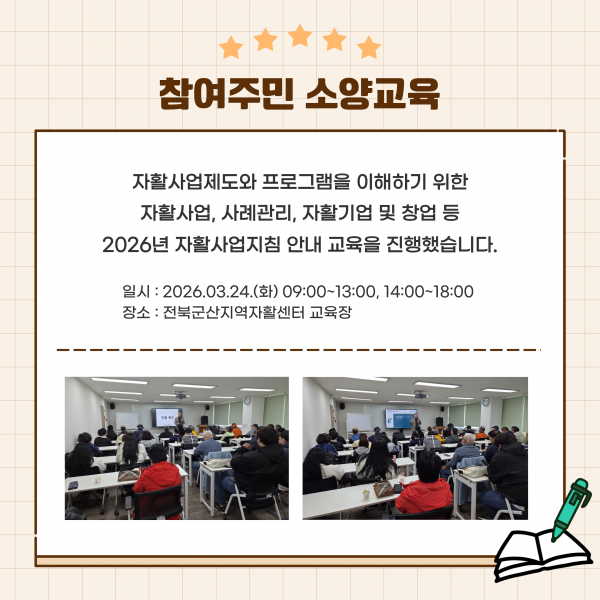 참여주민 소양교육 [2026년 자활사업지침 안내 교육] 작성자 관리자 | 작성일26-04-08 16:52 관련링크 이전글 다음글 목록 답변 본문 이전글 2026년 1분기 소식지 다음글 참여주민 직무교육 [자활기업 창업준비교육] 댓글목록 등록된 댓글이 없습니다. 이전글 다음글 목록 답변