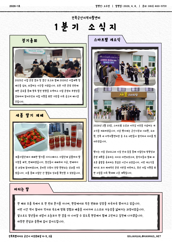2026년 1분기 소식지 작성자 관리자 | 작성일26-04-08 16:56 관련링크 다음글 목록 답변 본문 다음글 참여주민 소양교육 [2026년 자활사업지침 안내 교육] 댓글목록 등록된 댓글이 없습니다. 다음글 목록 답변