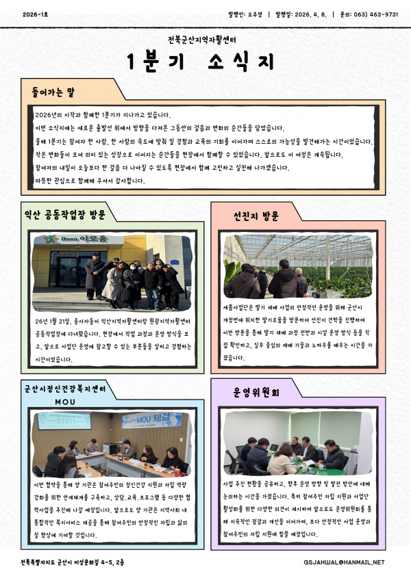 2026년 1분기 소식지 작성자 관리자 | 작성일26-04-08 16:56 관련링크 다음글 목록 답변 본문 다음글 참여주민 소양교육 [2026년 자활사업지침 안내 교육] 댓글목록 등록된 댓글이 없습니다. 다음글 목록 답변