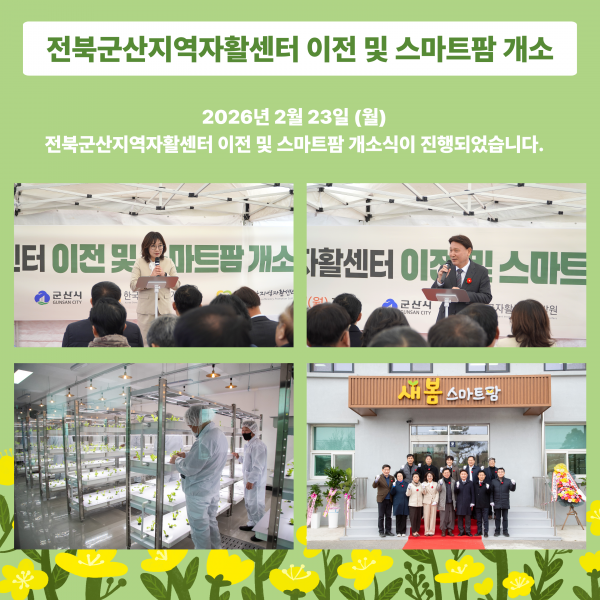 2026년 전북군산지역자활센터 이전 및 스마트팜 개소 작성자 관리자 | 작성일26-04-07 14:51 관련링크 이전글 다음글 목록 답변 본문 이전글 참여주민 소양교육 [직장 내 예절과 존중의 기술] 다음글 전북군산지역자활센터 2026년 예산서 댓글목록 등록된 댓글이 없습니다. 이전글 다음글 목록 답변