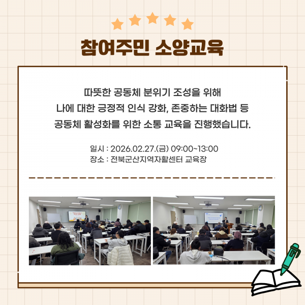 참여주민 소양교육 [공동체 활성화를 위한 소통] 작성자 관리자 | 작성일26-04-07 16:34 관련링크 이전글 다음글 목록 답변 본문 이전글 참여주민 직무교육 [자활기업 창업준비교육] 다음글 참여주민 소양교육 [직장 내 예절과 존중의 기술] 댓글목록 등록된 댓글이 없습니다. 이전글 다음글 목록 답변